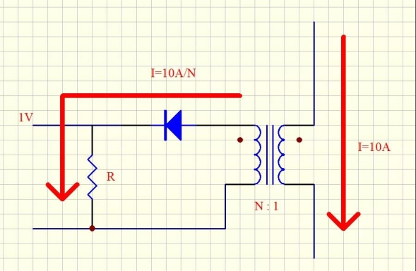 假定用電流互感器檢測變換器的原邊電流,原邊10A電流對應1V電壓。當然,我們可以用一個1V/10A=100mΩ的電阻來檢測,可是電阻將構成的損耗為1V×10A=10W,這么大的損耗對簡直一切的規劃來說都是不能承受的。所以,要選用電流互感器,如圖1所示。