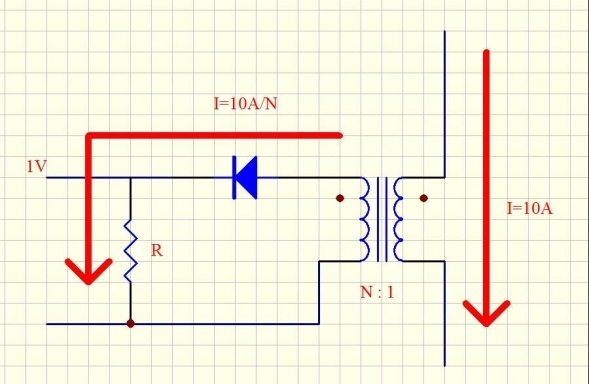 假定用電流互感器檢測變換器的原邊電流,原邊10A電流對應(yīng)1V電壓。當(dāng)然,我們可以用一個(gè)1V/10A=100mΩ的電阻來檢測,但是電阻將構(gòu)成的損耗為1V×10A=10W,這么大的損耗對簡直一切的規(guī)劃來說都是不能接受的。所以,要選用電流互感器,如圖1所示。